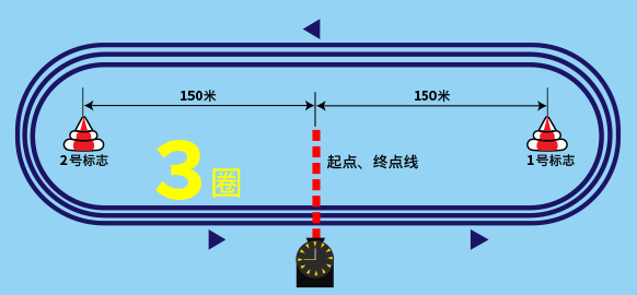 赛艇通过起点线后,以1号回旋标志、2号回旋标志的顺序绕赛道三周(每周600米,共1800米),按到达终点的先后顺序确定名次。