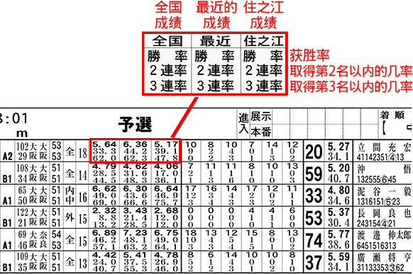 除了参赛者的信息外,参赛表中同样也记录有马达和赛艇的登记号码和成绩(2连对率)。马达和赛艇归各比赛场地所有,参赛者之间通过抽签进行分配。马达和赛艇的2连对率,数值越高,可以判断其性能越是优良。