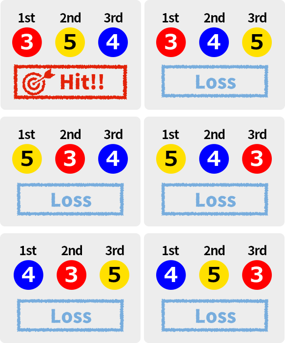 Pick the exact three boats that finish first, second, and third in order Example: If you buy a betting ticket for 3-5-4■Hitting ratio = 1/120