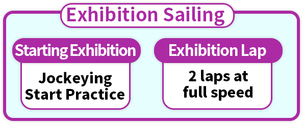 Before the actual race, each racer has an exhibition sailing session, practicing the intended jockeying and race start and demonstrating to spectators their boat/motor in good form by doing 2 laps at full speed. There are two types of Exhibition Sailing; Starting Exhibition and Exhibition Lap.