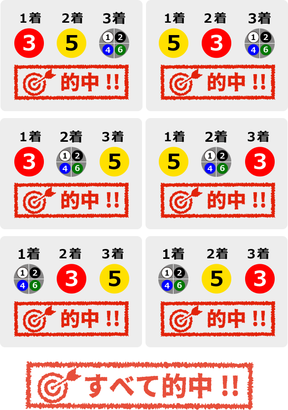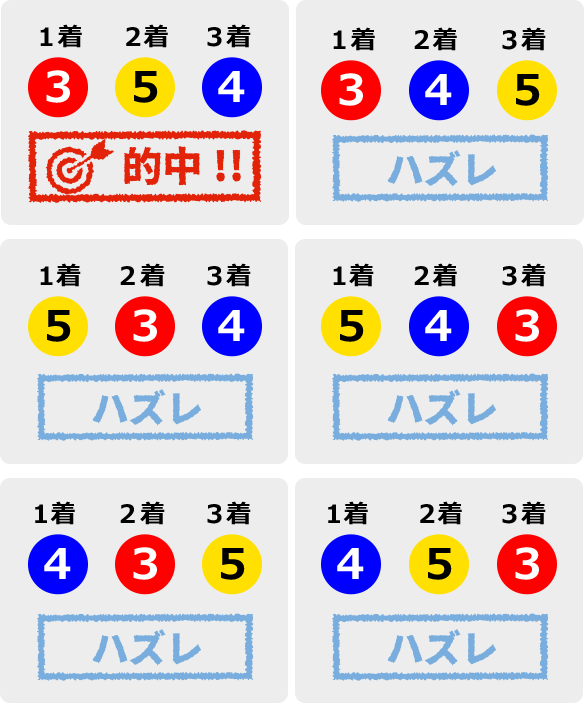 1着2着3着の艇を順位に関わらず当てる 例)3-5-4を買った場合■的中率1/20