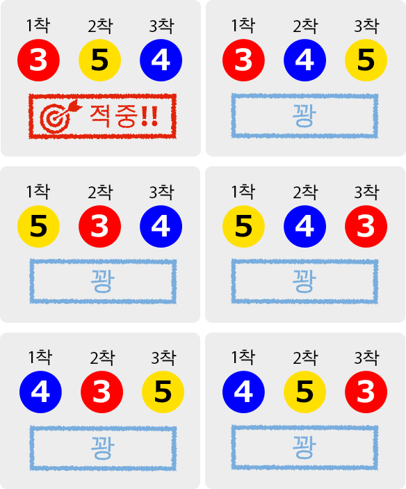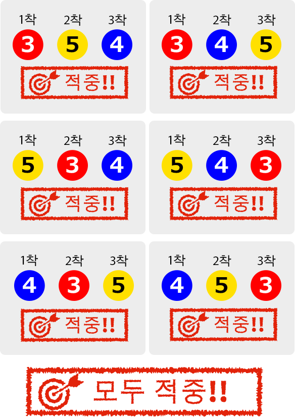 1착, 2착, 3착 보트를 도착순대로 맞춘다 예)3-5-4를 구매한 경우■적중률 1/120