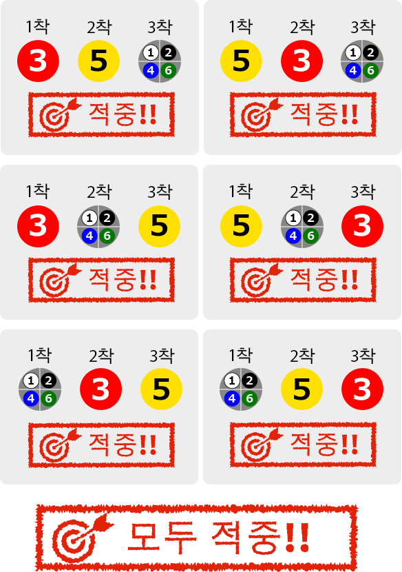 3이 1착 및 5가 2착이라도 적중이고, 5가 1착 및 3이 2착이라도 적중이 됩니다.