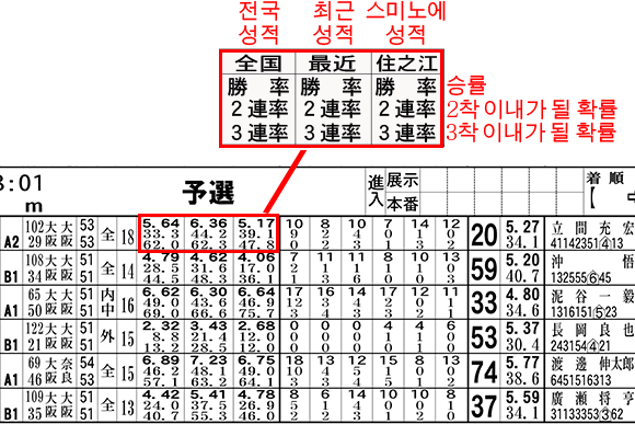 출주표에는 모터와 보트에도 레이서와 마찬가지로 등록번호와 성적(2연대율)이 기재되어 있습니다. 모터와 보트는 각 레이스장이 소유하며 레이서에게는 추첨으로 할당됩니다. 모터와 보트의 2연대율은 수치가 높을수록 우량이라고 판단할 수 있습니다.